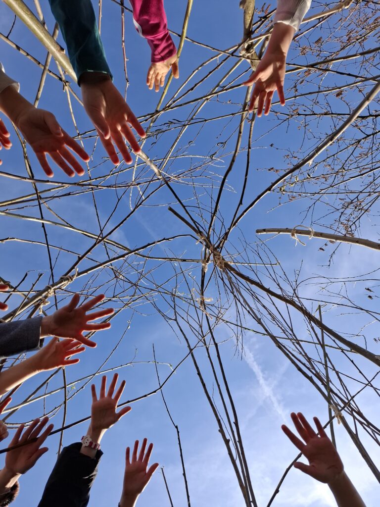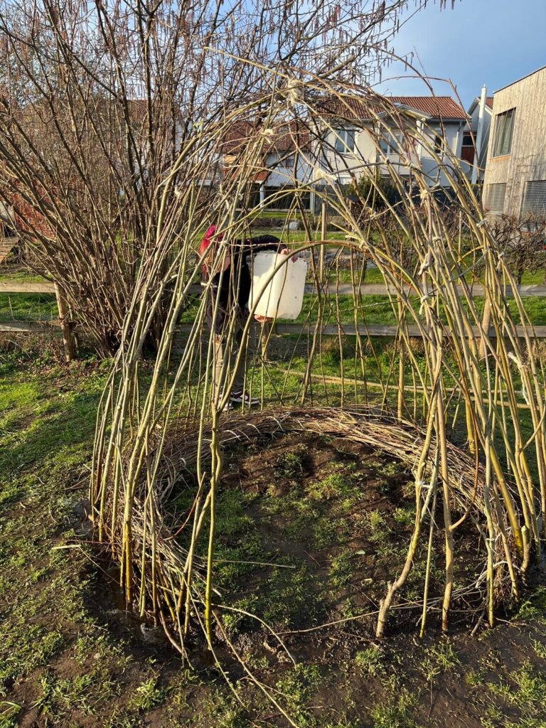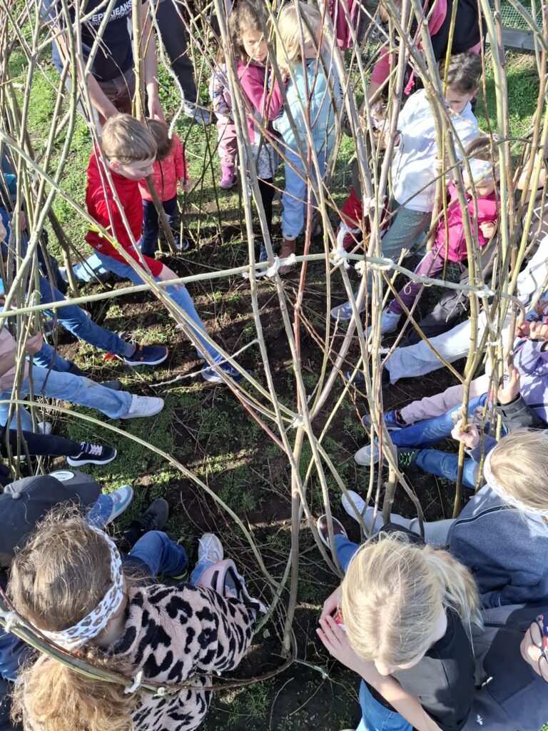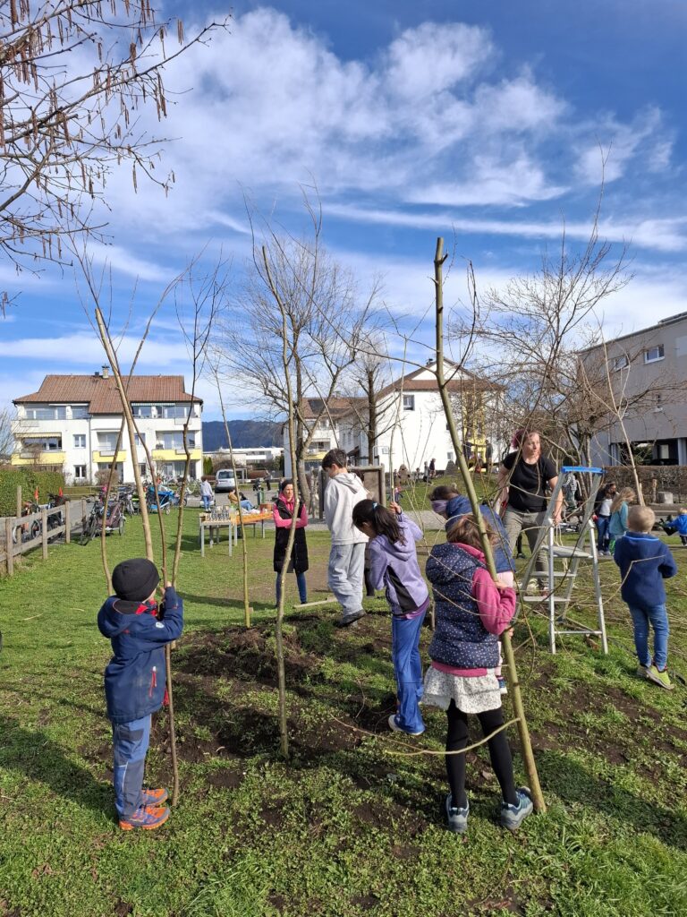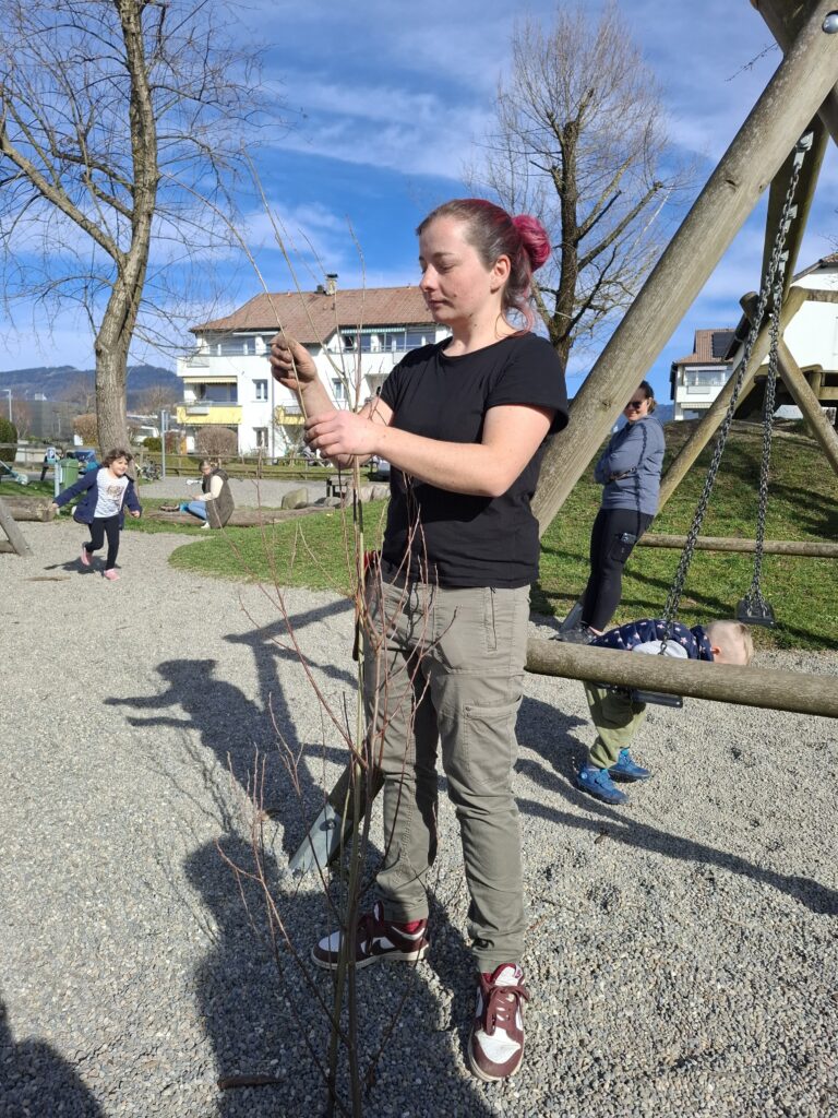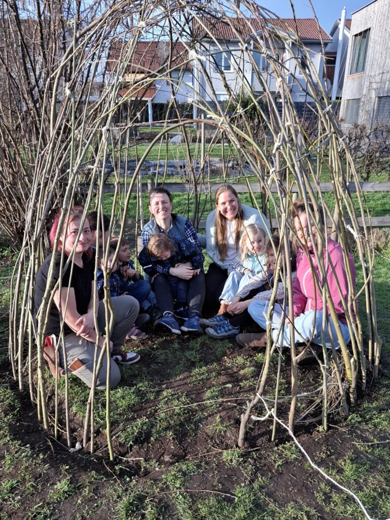 Mit viel Einsatz und Begeisterung machten sich die Familien gemeinsam mit der Expertin Nicki Meusburger an diesem Nachmittag ans Werk. Das Ergebnis können nun alle Spielplatzbesucher:innen bestaunen. Die fleißigen Helfer:innen freuten sich über ihr selbstgebautes Weidentipi und ließen den Nachmittag an der frischen Luft bei einer gesunden Jause ausklingen.